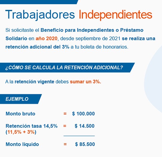 Para provisionar el pago de cada una de estas cuotas, la ley estableció que a partir del 01 de septiembre de 2021 se aplicará una retención adicional de un 3% a la retención que se le aplica tanto a las Boletas de Honorarios Electrónicas (BHE) emitidas, como las Boletas de Prestación de Terceros Electrónicas (BTE) recibidas. Esta retención adicional se aplicará también a los sueldos que sean pagados por los empleadores. Los montos por este concepto de retención adicional se destinarán íntegramente a apoyar la devolución del préstamo solidario otorgado.